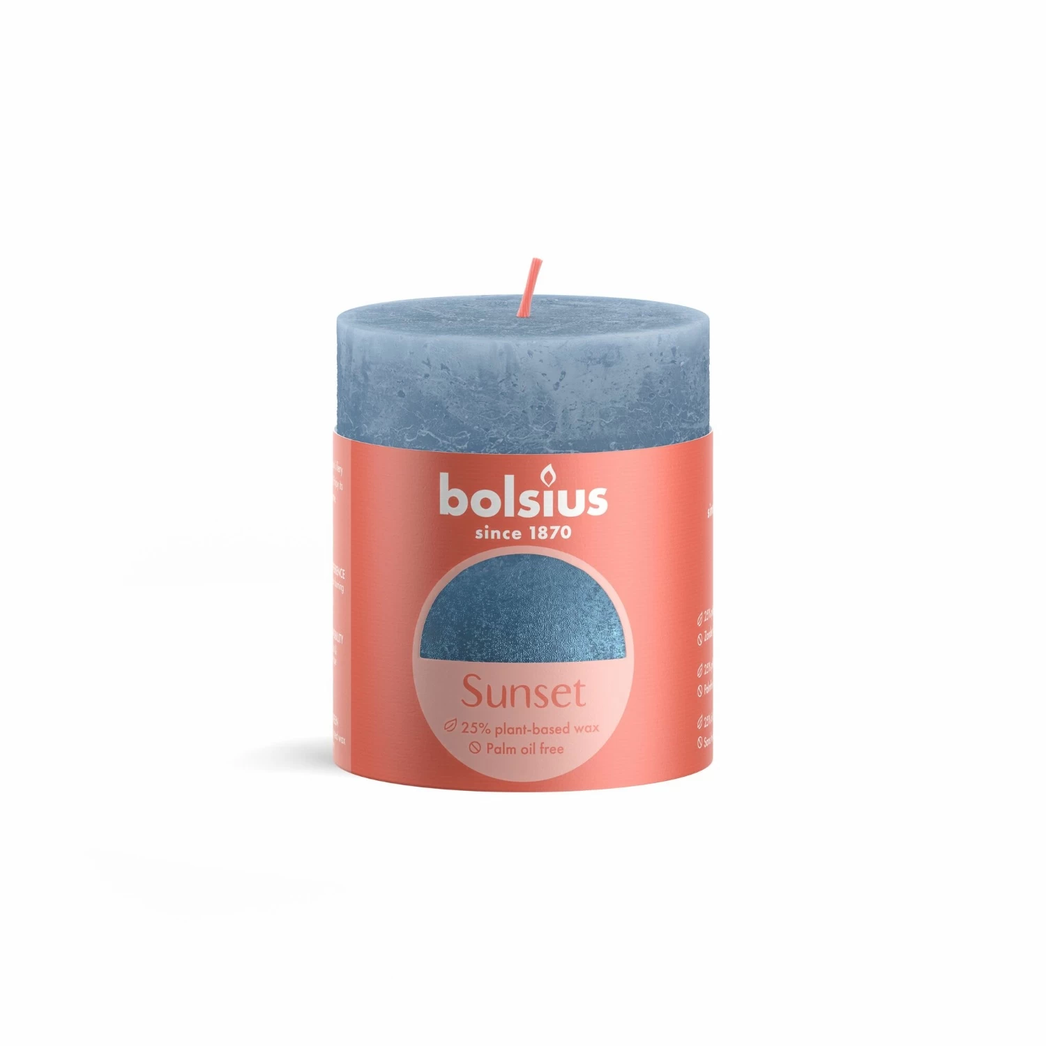 Deze klassieke rustieke Bolsius kaars in de kleur Sunset met een metallic blauwe gloed heeft een afmeting van 8 x 6,8 cm. De kaars zorgt voor een gezellige en warme sfeer in de woonkamer tijdens een avondje bankhangen of een ontspannende sfeer in de badkamer tijdens het badderen. De kaars brand na ca. 35 uren op en roet niet. Combineer de kaars met andere kleuren of formaten van kaarsen en plaats ze op een plateau voor een mooi effect.