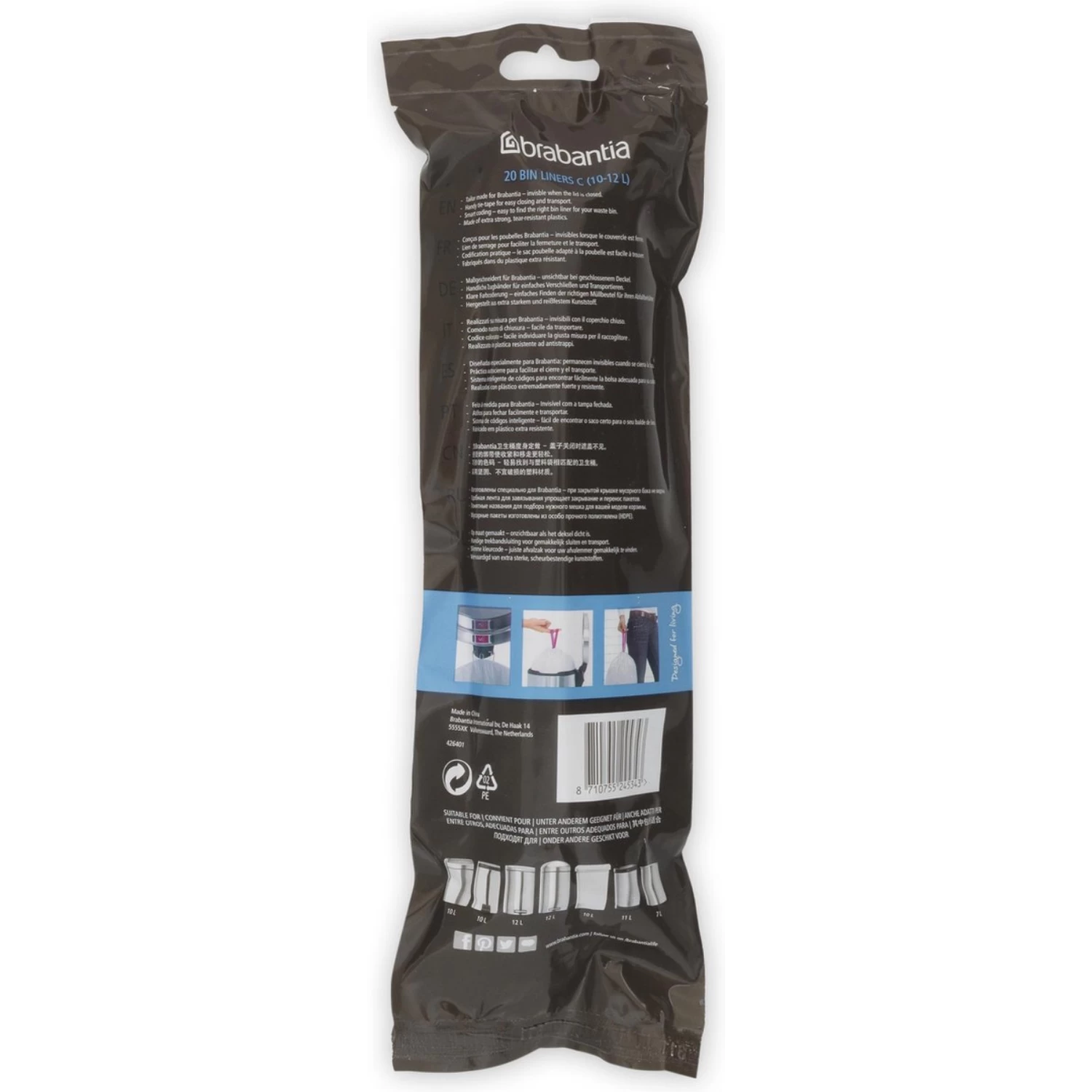 Brabantia PerfectFit afvalzakken C 10-12 liter passen perfect in de Brabantia prullenbakken met de code C. Doordat ze extra sterk zijn scheuren en lekken ze niet, en de zakken hebben een handige trekbandsluiting om de zakken uit de bak te trekken en dicht te knopen.