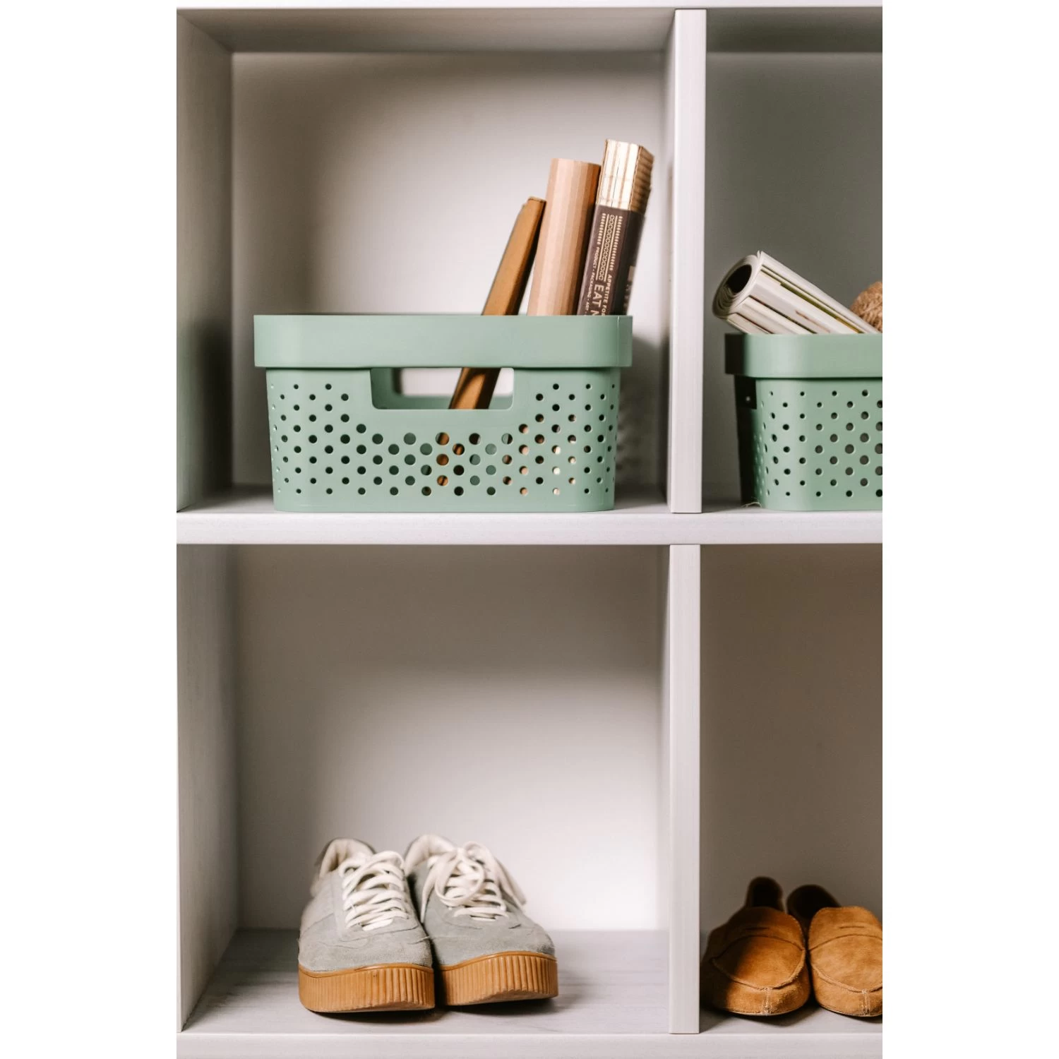 In deze groene Infinity Dots box past een inhoud van 11 liter. De Curver Infinity Dots lijn is verkrijgbaar in verschillende kleuren en structuren, geïnspireerd op Scandinavisch design De boxen hebben comfortabele handgrepen, zijn eenvoudig schoon te maken en zijn makkelijk stapelbaar met deksel (apart verkrijgbaar). Met kleuren die passen bij elke smaak, van klassiek wit tot donkergrijs, laten de producten zich perfect met elkaar combineren in een oneindig aantal mogelijkheden! Een ware toevoeging aan iedere huiskamer, slaapkamer, speelkamer etc.