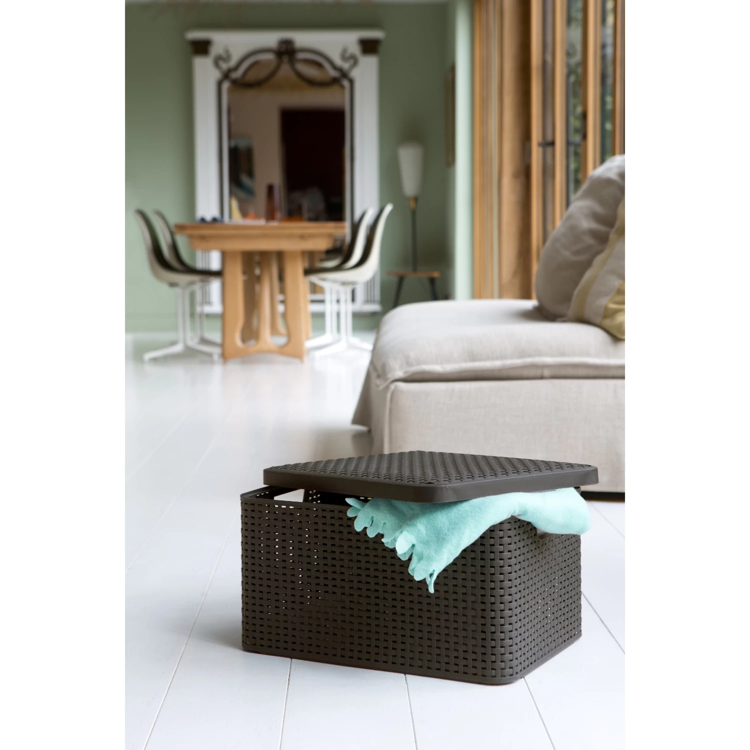 Met een inhoud van 30 liter biedt dit mandje voldoende ruimte voor het opbergen van diverse items, zoals kleding, toiletartikelen, keukenbenodigdheden, of zelfs speelgoed. Het deksel zorgt voor een nette en stofvrije opslag en maakt het eenvoudig om je spullen te ordenen en stapelen.