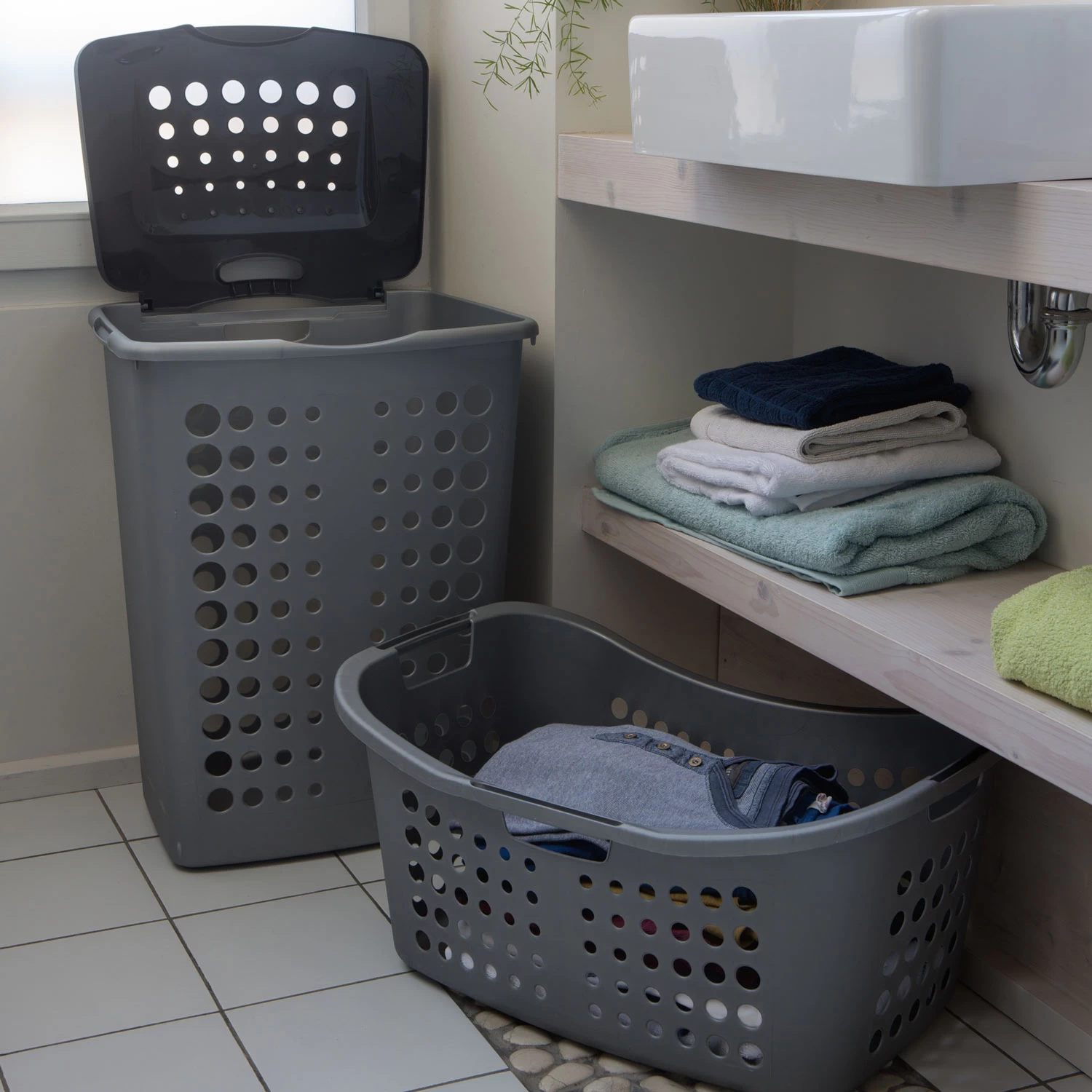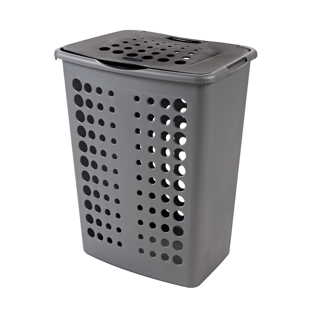 In deze grijs zilver Victor Curver wasbox past een inhoud van 60 liter vuile was. De box heeft aan 3 zijkanten handgrepen zodat je de wasmand op een makkelijke manier kunt verplaatsen. De deksel van de wasmand kan volledig worden opengeklapt. Dankzij de ventilatiegaten bieden de deksel en de box een optimale beluchting. Afmeting: 45,4 x 34,1 x 57,1 cm.