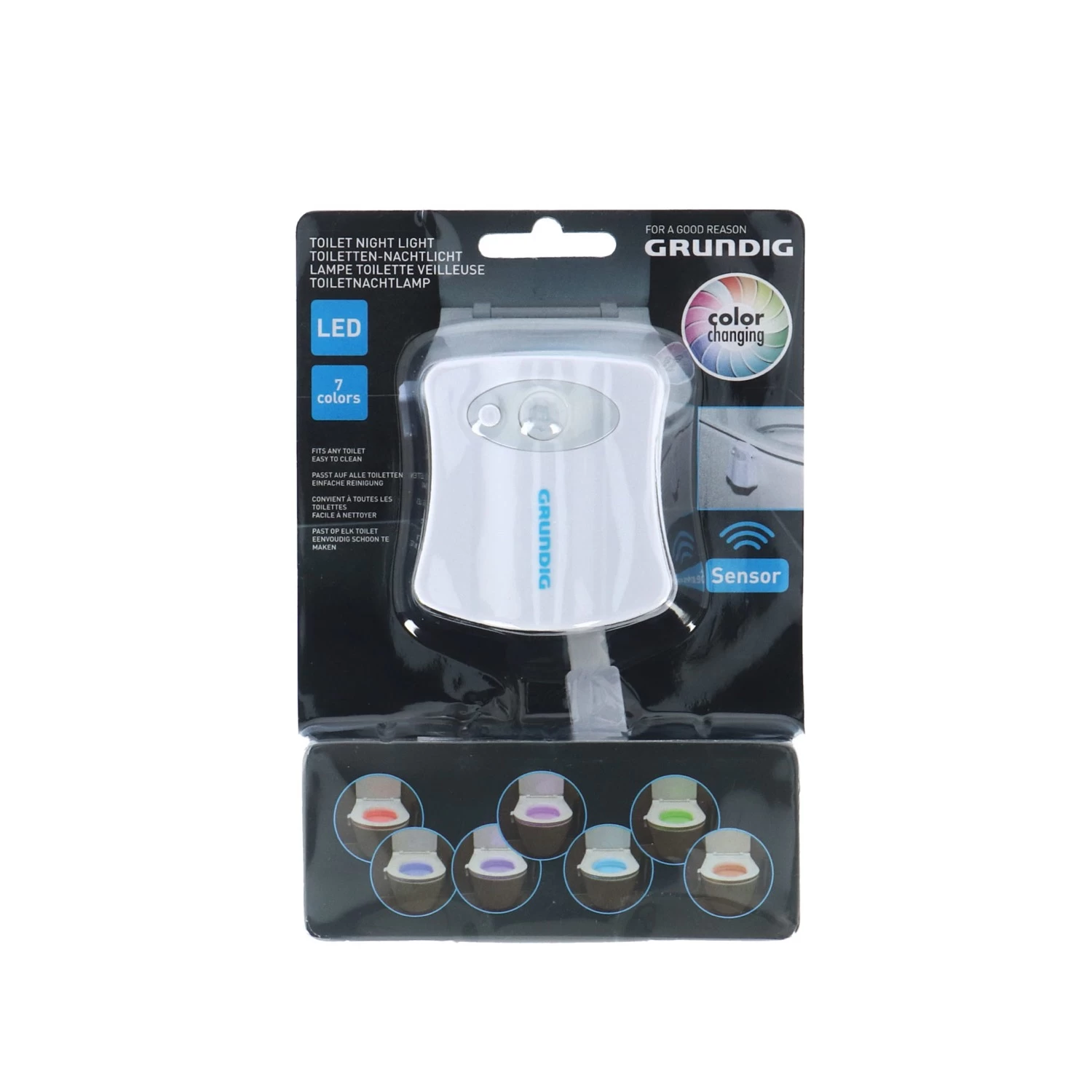 Met de Grundig LED toiletnachtlamp creëer je ‘s avonds een sfeervol toilet! Het nachtlampje plaats je onder de rand van de wc met het lampje aan de binnenkant en de sensor aan de buitenkant. Binnen ongeveer 1-1,5 meter ziet de sensor dat er iemand is en zal het lichtje aan gaan. Je hebt keuze tussen telkens veranderende regenboog kleuren (rood, groen, paars, turkoois, blauw, geel, wit) of de optie voor één constante kleur. Deze stel je eenvoudig in met de knop. Na 2 minuten na detectie van de laatste beweging schakelt hij automatisch uit. Een sfeervolle gadget voor in de wc!