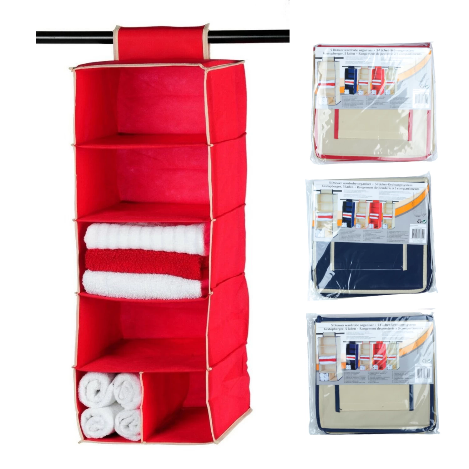 Hang deze handige kastopberger gemakkelijk met de lus van klittenband aan een rek of stang en order je kleding, beddengoed of handdoeken. De kastopberger heeft 5 laden en heeft een afmeting van 75 x 28 x 28 cm.