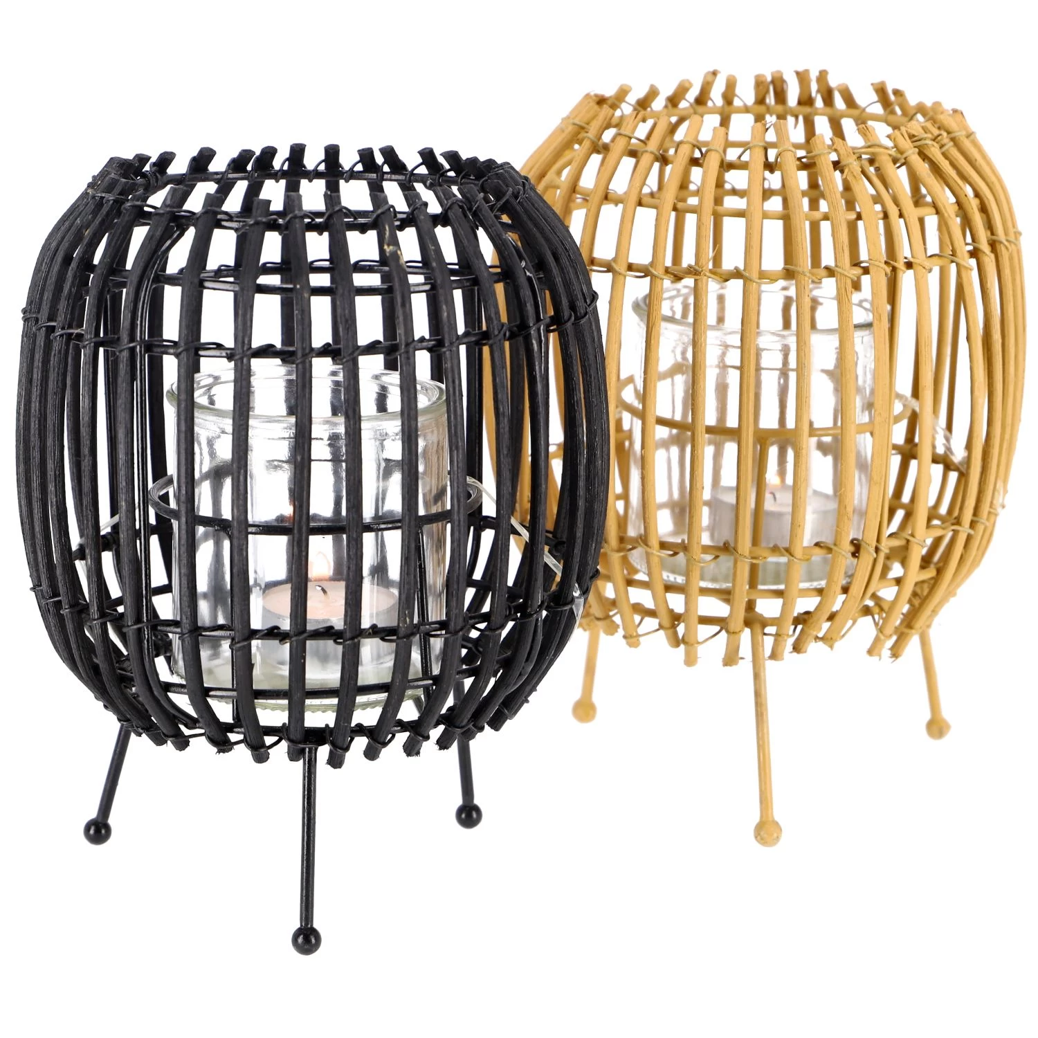 De lantaarn met rattan look in beige of zwart is ideaal om te plaatsen op je bijzettafel of op de tuintafel. De lantaarn is gemaakt van ijzer en hout en heeft een glazen kaarsenhouder waar een groot waxinelicht in past.