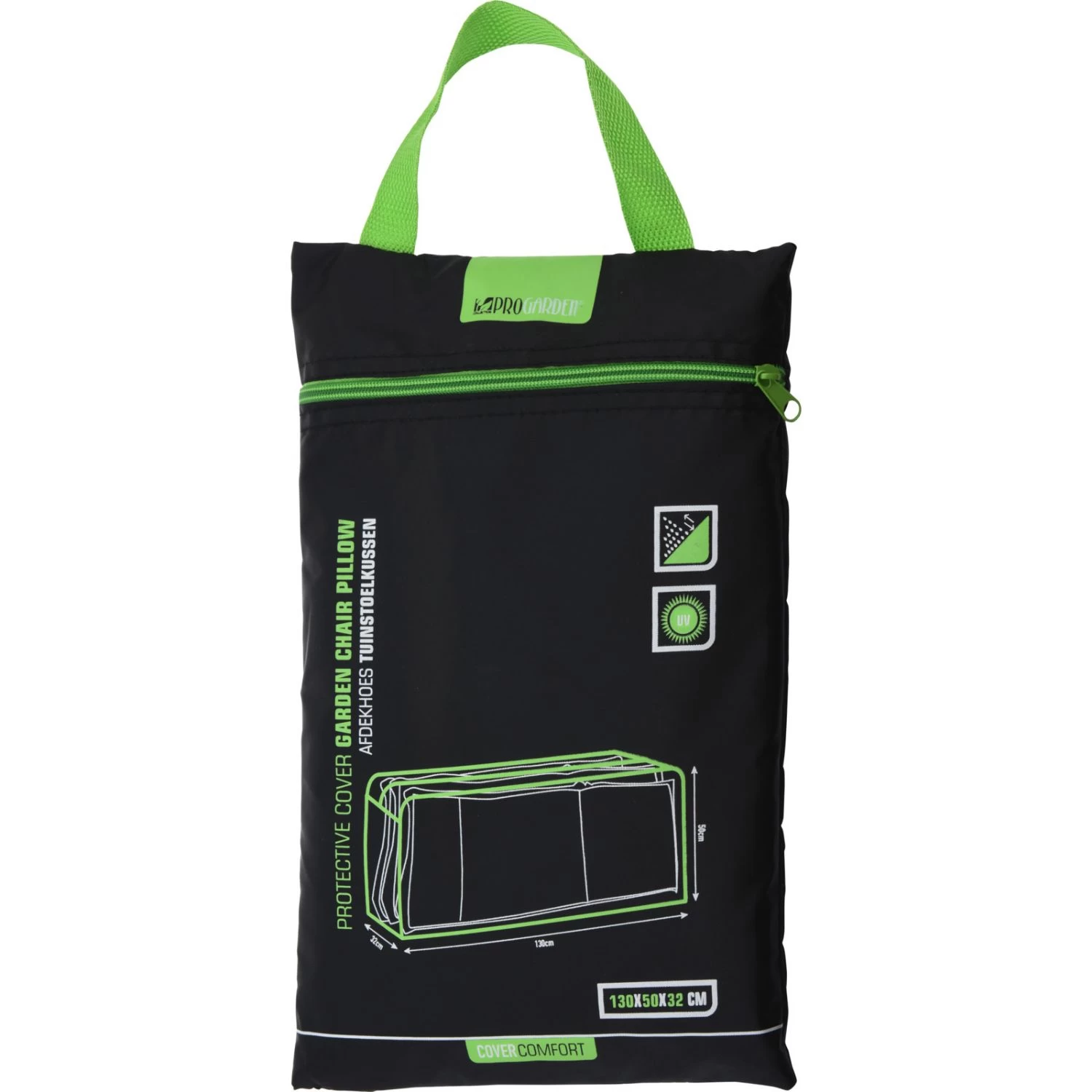 Als jij jouw tuinkussens graag droog en schoon wilt bewaren is deze tuinkussenhoes van Pro Garden perfect voor jou! Met een formaat van 130x50x32 cm is hij groot genoeg voor 4 standaard tuinkussens. De hoes is gemaakt van zwart polyester, waardoor hij waterafstotend en UV-bestendig is.