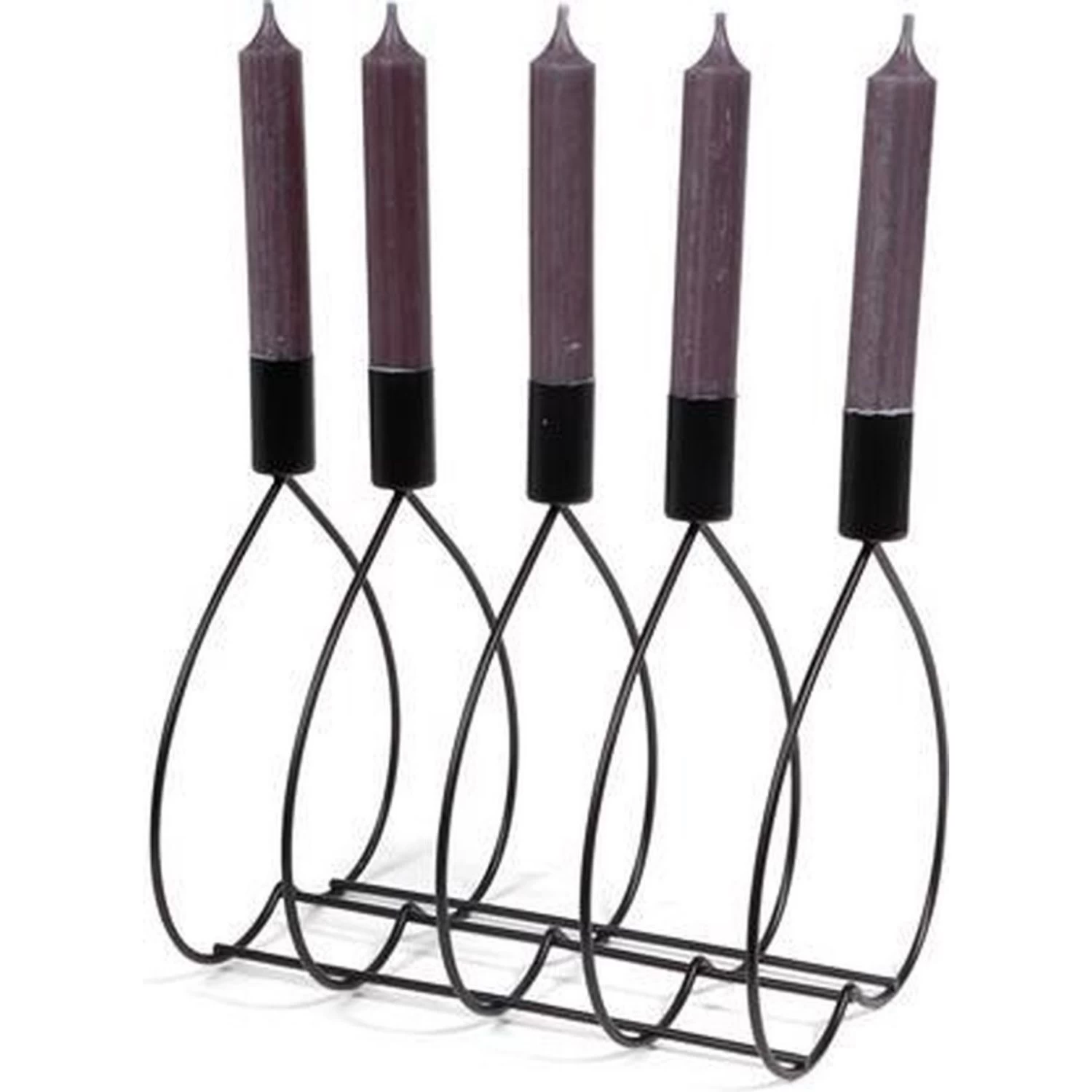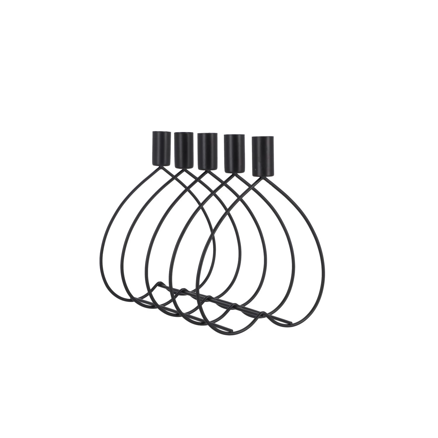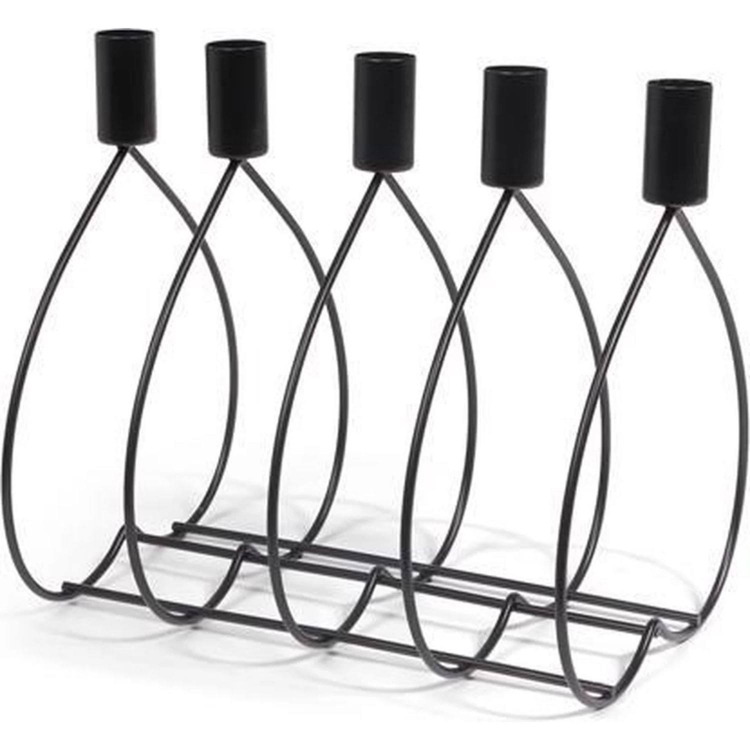 In deze kandelaar passen 5 dinerkaarsen zodat je een fijne sfeer van kaarslicht kunt creëren. De zwarte metalen kandelaar heeft een lengte van 22 cm en heeft 5 hartvormige spiralen die uitlopen tot een kandelaar. Plaats hem midden op de eettafel of op een bijzettafel naast de bank voor een warme sfeer in huis.