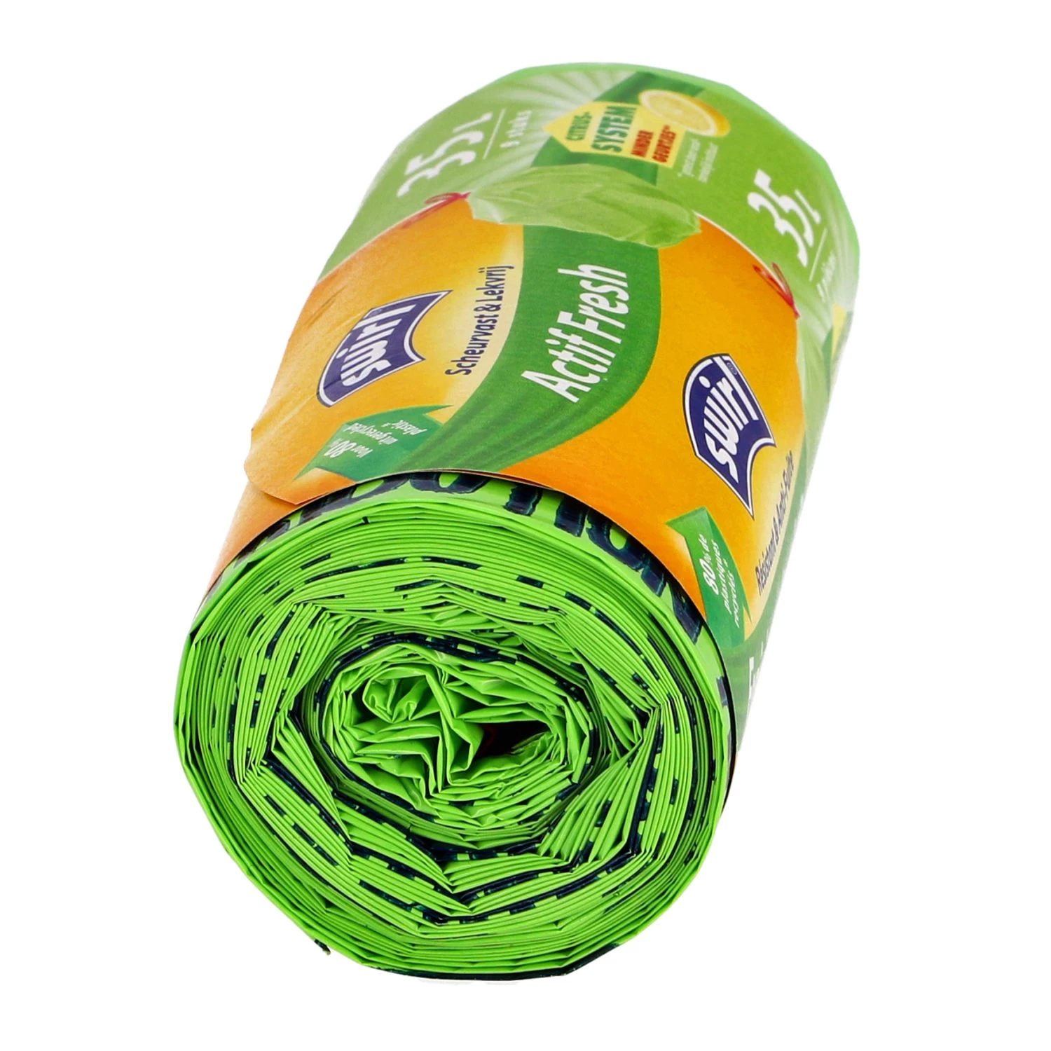 Swirl ActifFresh Trekband 35L met de fruitig-frisse citrusgeur is populair voor het neutraliseren van slechte geuren. Swirl maakt gebruik van dit voordeel. De vuilniszak Actif Fresh neutraliseert slechte geuren met zijn innovatieve technologie en geeft bovendien een zachte citrusgeur af! De natuurlijke absorber is biologisch afbreekbaar en is vriendelijk voor mens en milieu. De ActifFresh pedaalemmerzakken van Swirl zijn uiterst scheurvast en natuurlijk waterdicht. Swirl ActifFresh pedaalemmerzakken zijn gemaakt van minstens 80% gerecycled plastic en daarvan is minstens de helft (40%) afkomstig uit post-consumer plastic afval